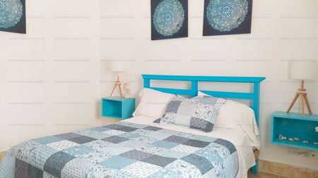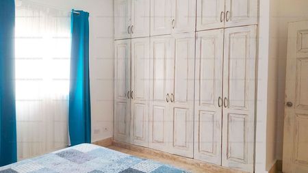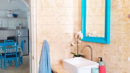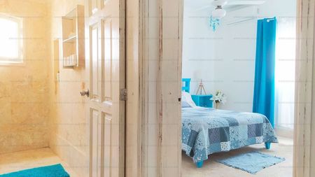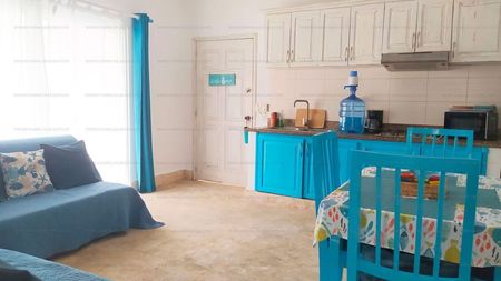 Los pisos y el área del baño del apartamento están hechos de piedra de coral natural, añadiendo un toque de lujo al espacio. Los muebles están pintados utilizando la técnica shabby chic, creando un ambiente encantador y acogedor. Sal al espacioso balcón, donde podrás disfrutar de tu café matutino mientras contemplas un jardín tropical.