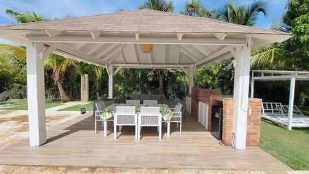La villa cuatro habitaciones con sus baños, medio baño, sala, comedor, cocina, área de lavado, cuarto de servicio con su baño, una terraza grande zona la zona de BBQ, piscina con jacuzzi, que le dará el máximo confort y una experiencia inolvidable de su parada.