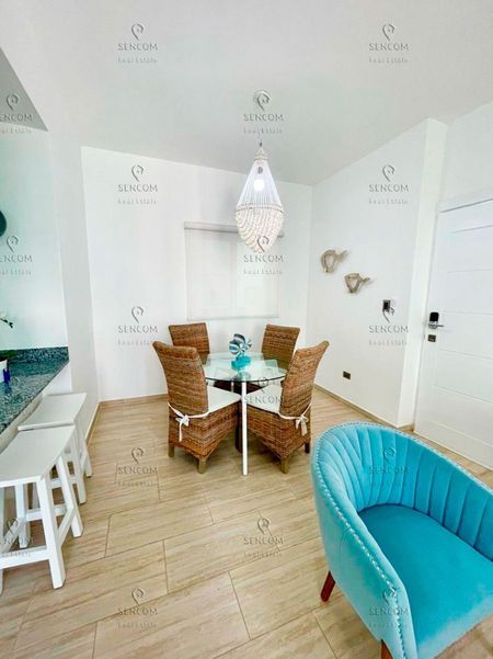 Este apartamento de un dormitorio completamente amueblado viene equipado con electrodomésticos modernos, una cocina y un baño, lo que garantiza comodidad y conveniencia. Su diseño de planta abierta integra perfectamente la cocina con la sala de estar, con un amplio balcón y un comedor con impresionantes vistas a la amplia piscina.