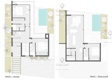 En el primer nivel se ubican la cocina, el comedor y la sala de estar en una amplia disposición abierta con salida a la terraza y la piscina. Las grandes ventanas y puertas corredizas de vidrio crean una conexión perfecta entre el espacio interior de la villa y el entorno exterior. Uno de los principales atractivos de la villa es la piscina, rodeada de una zona de descanso al aire libre con vistas impresionantes al campo de golf. Desde el dormitorio, ubicado en el primer nivel, se accede a la piscina y al campo de golf, brindando una sensación única de tranquilidad y proximidad a la naturaleza.